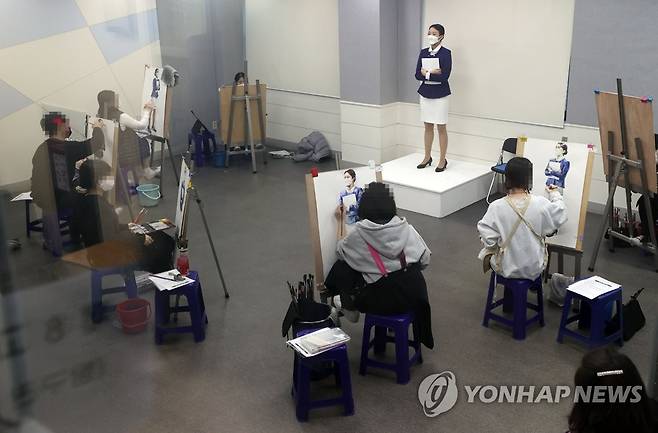 (서울=연합뉴스) 김인철 기자 = 16일 오후 서울 성북구 한성대학교에서 열린 2021학년도 정시 예술학부 실기고사에 응시한 수험생들이 신종 코로나바이러스 감염증(코로나19) 예방을 위해 1.5m 간격을 두고 앉아 그림을 그리고 있다. 2021.1.16
