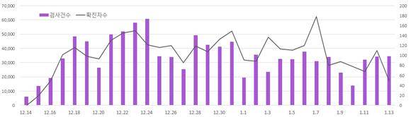 <수도권 임시선별검사소 검사·확진자 현황(‘20.12.14∼’21.1.13)>