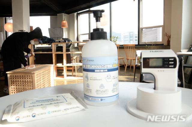 '18일에 카페 취식 가능해지자 꼼꼼하게 소독하는 카페 사장님'