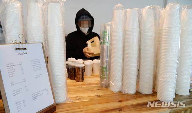 정부의 신종 코로나바이러스 감염증(코로나19)에 대한 사회적 거리두기 조정안이 발표된 16일 전북 전주시 완산구에 위치한 한 카페에서 사장이 배달 음료를 정리하고 있다.