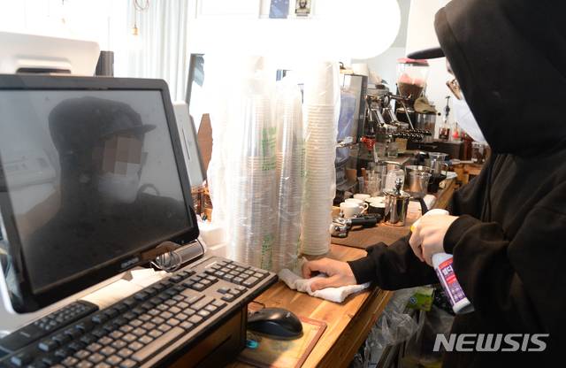 '카페 18일 취식 가능 발표에 내부 소독하는 카페 사장님'