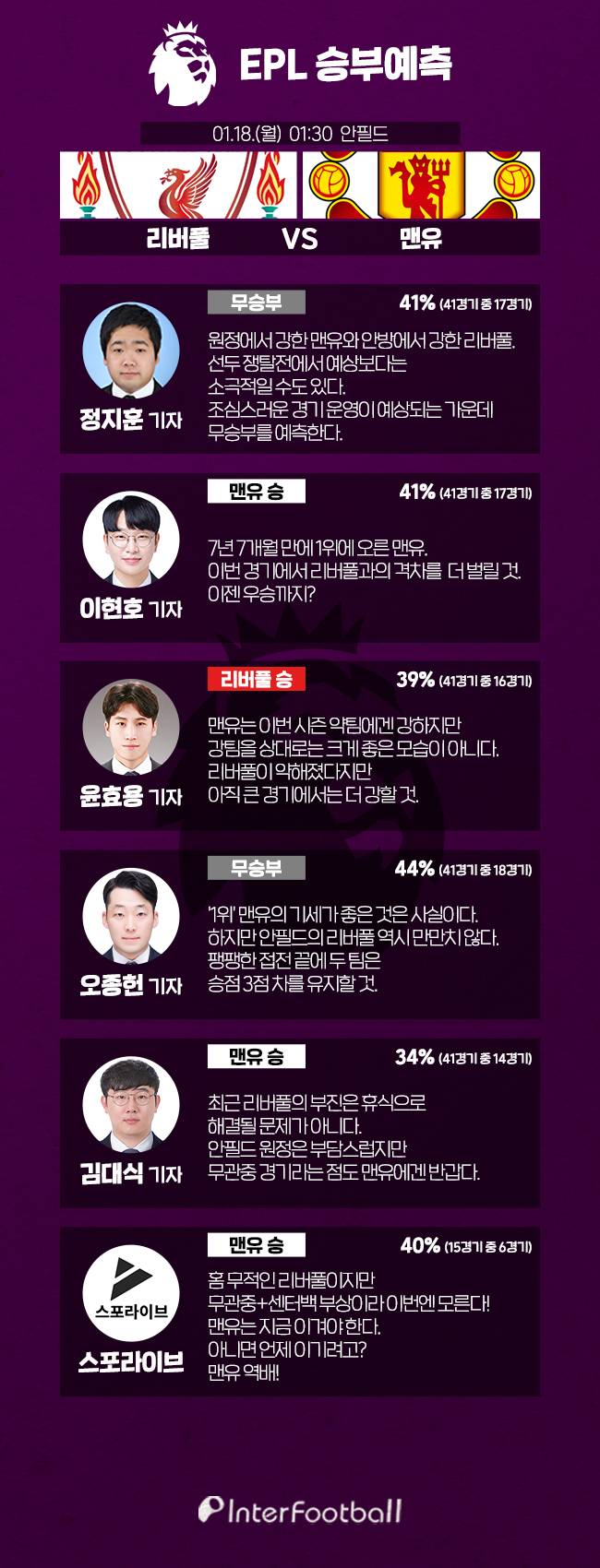최근의 흐름을 봤을 때 맨유 승리를 예측하는 기자들이 더 많았다. 특히 리버풀은 부상자 발생으로 어려움을 겪고 있기 때문에 상승세를 탄 맨유를 막기는 힘들 것이라는 전망이다. 그러나 리버풀의 저력이 있고, 안방에서는 불패이기 때문에 무승부 또는 리버풀 승리를 예측하는 기자들도 있었다. '스포츠 승부예측 게임(스포츠 베팅게임) 업계 1위' 스포라이브는 맨유의 승리를 예측했다.