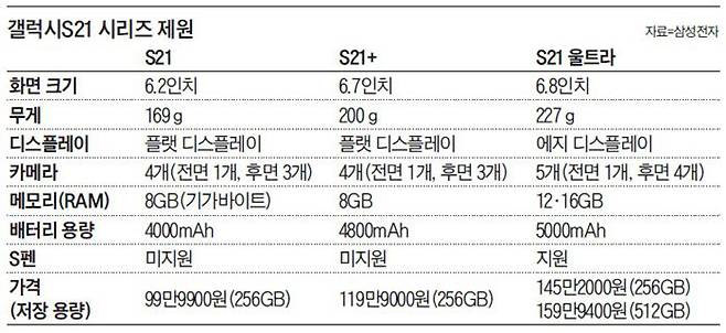 김성민(가성비를 따지는 13년차 기자): 울트라 모델의 경우 ‘S펜’을 보관하는 실리콘 커버까지 씌우니 더 커져 남자인 나도 한손으로 잡기 버겁다. 제일 비싼 모델은 소비자들이 제일 사고 싶게 만들어야 하는데, 나에게 갤럭시 S21시리즈는 반대다. 기본형이 크기와 두께 등에서 마음에 든다. 99만9900원이라는 가격도 기본 모델의 훌륭한 스펙 중 하나다. 그런데 아무리 가격을 낮추기 위해서라도 전작보다 일부 사양이 떨어진 것은 아쉽다. 기본모델과 플러스는 램 용량이 각각 8기가바이트(GB)로 S20(12GB)보다 줄었고, 디스플레이 해상도도 낮아졌다. 충전기, 유선 이어폰 뿐 아니라 마이크로SD 카드 슬롯도 사라졌다.