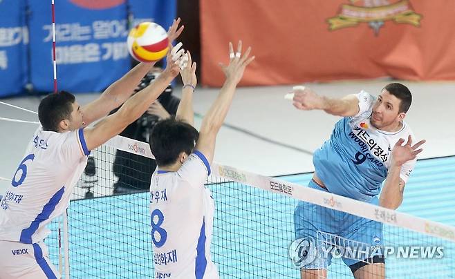 (서울=연합뉴스) 16일 오후 대전 충무실내체육관에서 열린 2020-2021 프로배구 남자부 삼성화재 블루팡스와 우리카드 위비의 경기에서 우리카드 알렉스가 공격하고 있다. 2021.1.16