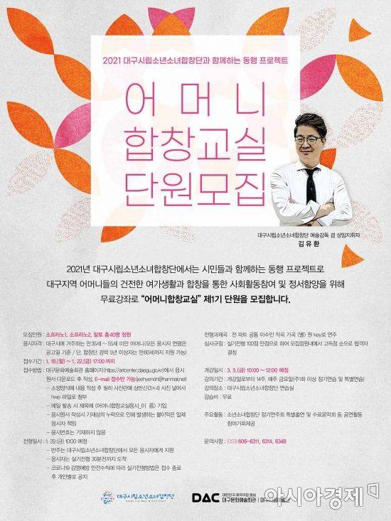 [아시아경제 영남취재본부 박동욱 기자] 대구시립소년소녀합창단(예술감독 김유환)은 창단 40주년을 맞아 어머니합창교실 제1기 단원을 모집한다.