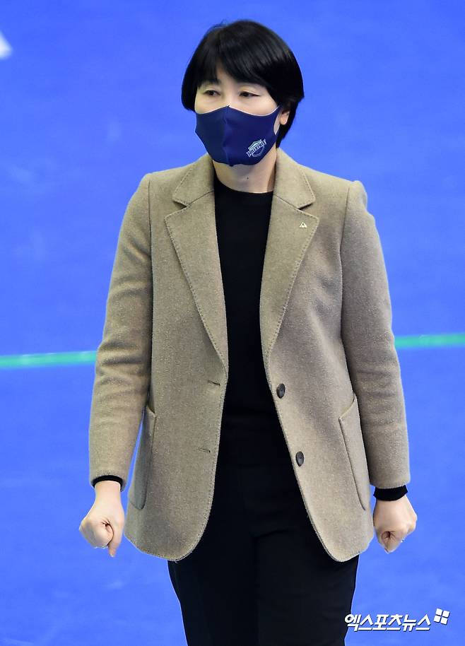 [엑스포츠뉴스 수원, 김한준 기자] 16일 오후 경기도 수원실내체육관에서 열린 ‘2020-2021 도드람 V리그’ 현대건설과 한국도로공사의 경기, 현대건설 이도희 감독이 경기를 지켜보고 있다.