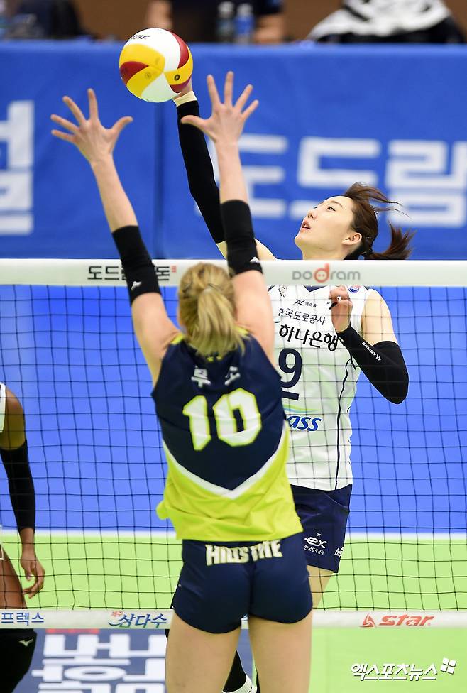 [엑스포츠뉴스 수원, 김한준 기자] 16일 오후 경기도 수원실내체육관에서 열린 ‘2020-2021 도드람 V리그’ 현대건설과 한국도로공사의 경기, 도로공사 박정아가 공격을 시도하고 있다.