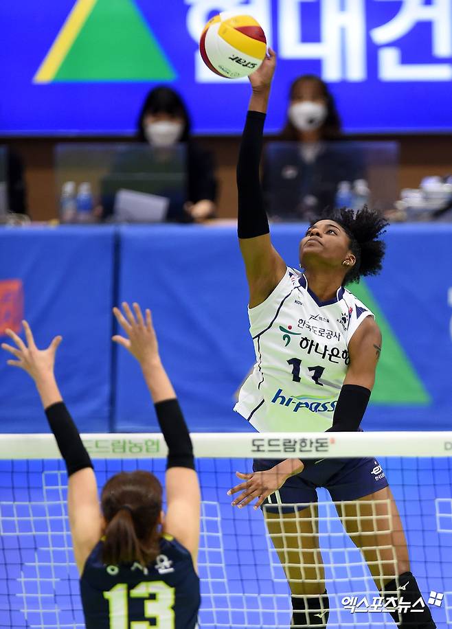 [엑스포츠뉴스 수원, 김한준 기자] 16일 오후 경기도 수원실내체육관에서 열린 ‘2020-2021 도드람 V리그’ 현대건설과 한국도로공사의 경기, 도로공사 켈시가 공격을 시도하고 있다.