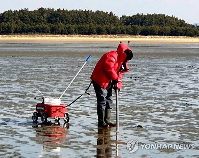 (태안=연합뉴스) 이은파 기자 = 전국 대부분이 영하권으로 떨어진 16일 충남 태안군 남면 몽산포해수욕장에서 한 주민이 특수장비를 이용해 개불을 잡고 있다. 개불은 소시지 모양의 의충동물로, 육질이 연하고 쫄깃해 미식가들로부터 인기를 끌고 있다. 2021.1.16
