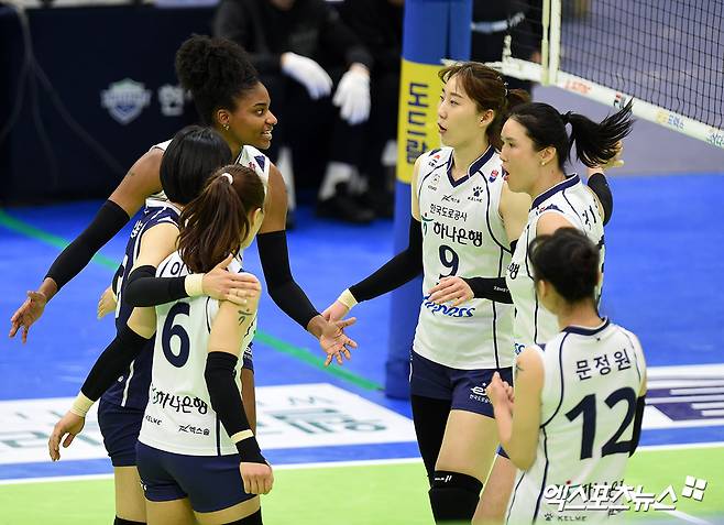 [엑스포츠뉴스 수원, 김한준 기자] 16일 오후 경기도 수원실내체육관에서 열린 ‘2020-2021 도드람 V리그’ 현대건설과 한국도로공사의 경기, 도로공사 선수들이 득점 후 기뻐하고 있다.