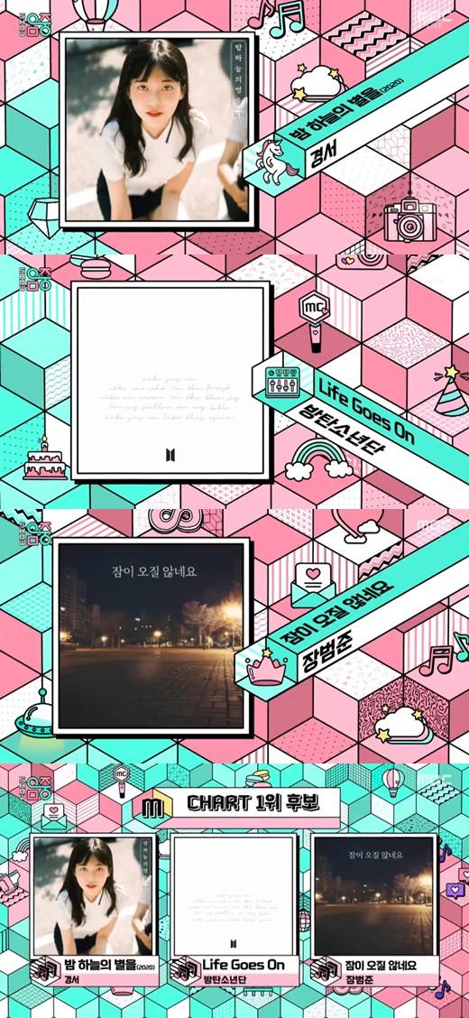 16일 오후 방송된 '쇼! 음악중심' 1위 후보에는 경서 '밤 하늘의 별을', 방탄소년단 '라이프 고즈 온(Life Goes On), 장범준 '잠이 오질 않네요'가 이름을 올렸다.