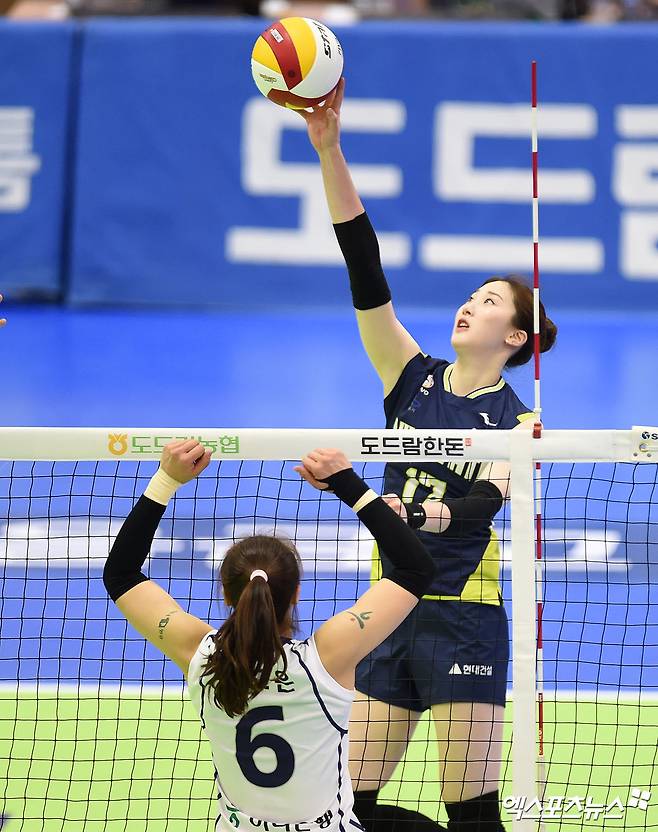 [엑스포츠뉴스 수원, 김한준 기자] 16일 오후 경기도 수원실내체육관에서 열린 ‘2020-2021 도드람 V리그’ 현대건설과 한국도로공사의 경기, 현대건설 고예림이 공격을 시도하고 있다.