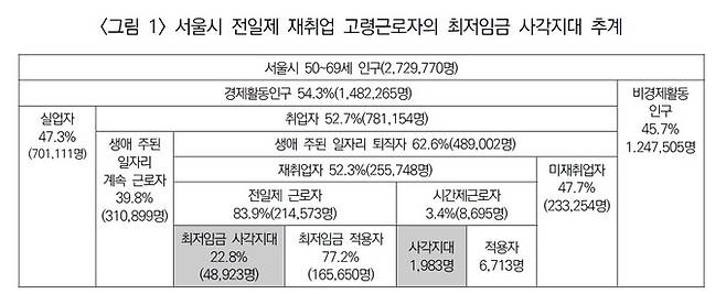 16일 계간지 ‘지방행정연구’ 최신호에 게재된 ‘생애 주된 일자리 퇴직자의 최저임금 사각지대 연구’에 따르면 2019년 서울시 재취업 전일제 고령자(50∼69세)의 22.8%는 최저임금(월 174만5000원)을 받지 못한 것으로 추계됐다. 이는 최저임금위원회에서 2020년 발표한 최저임금 미만 근로자 비율 16.5%보다 높은 것이다. 인구 수로 따지만 4만9000명 정도다.