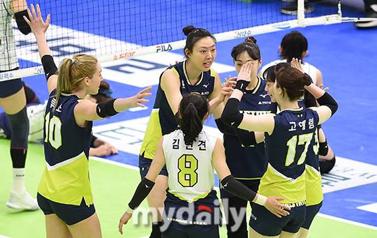 [마이데일리 = 수원 김성진 기자] 현대건설 선수들이 16일 오후 경기도 수원실내육관에서 진행된 '도드람 2020-2021 V리그' 여자부 현대건설과 한국도로공사의 경기에서 득점을 한 후 기뻐하고 있다.- ⓒ마이데일리(www.mydaily.co.kr). 무단전재&재배포 금지 -