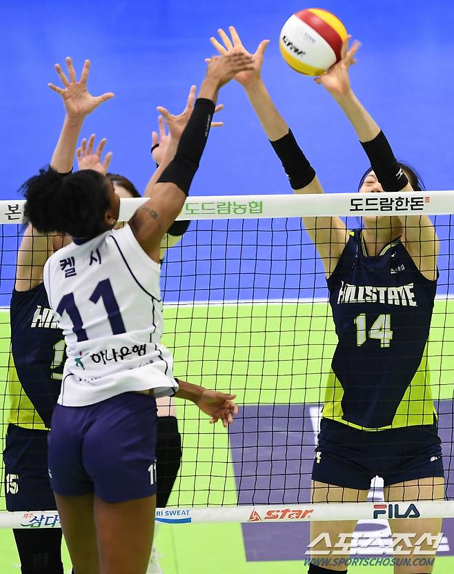 '2020-2021 V리그' 여자부 현대건설과 한국도로공사의 경기가 16일 수원실내체육관에서 열렸다. 한국도로공사 켈시가 블로킹 벽을 피해 공격을 시도하고 있다. 수원=박재만 기자 pjm@sportschosun.com/2021.01.16/