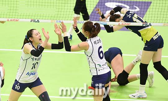[마이데일리 = 수원 김성진 기자] 한국도로공사 배유나가 16일 오후 경기도 수원실내육관에서 진행된 '도드람 2020-2021 V리그' 여자부 현대건설과 한국도로공사의 경기에서 현대건설 루소의 스파이크를 블로킹 한 후 이고은과 하이파이브를 하고 있다.- ⓒ마이데일리(www.mydaily.co.kr). 무단전재&재배포 금지 -