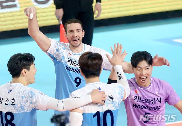 [서울=뉴시스]김명원 기자 = 16일 대전 충무실내체육관에서 열린 도드람 2020-2021V리그 우리카드와 삼성화재와의 경기에서 우리카드 장준호, 알렉스 등 선수들이 환호하고 있다. (사진=우리카드 배구단 제공) 2021.01.16. photo@newsis.com