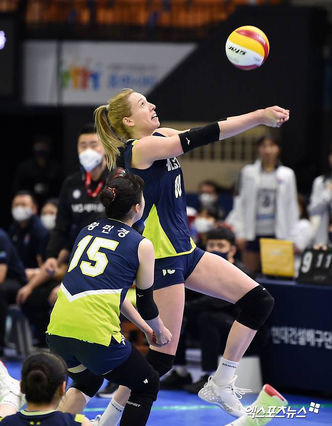 [엑스포츠뉴스 수원, 김한준 기자] 16일 오후 경기도 수원실내체육관에서 열린 ‘2020-2021 도드람 V리그’ 현대건설과 한국도로공사의 경기, 현대건설 루소가 공을 받아내고 있다.