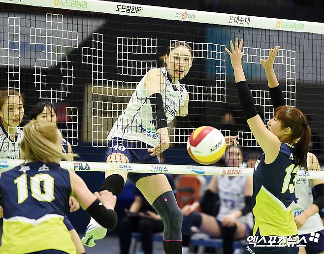 [엑스포츠뉴스 수원, 김한준 기자] 16일 오후 경기도 수원실내체육관에서 열린 ‘2020-2021 도드람 V리그’ 현대건설과 한국도로공사의 경기, 도로공사 배유나가 공격을 시도하고 있다.