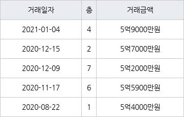 [이 기사는 조선비즈와 아티웰스가 공동으로 개발해 서비스하는 로봇 기사입니다.]국토교통부 실거래가 공개시스템에 따르면 지난 2021년 1월 4일 서울특별시 노원구 상계동 상계주공3단지 4층 전용면적 41㎡형이 5억9000만원에 거래됐다.