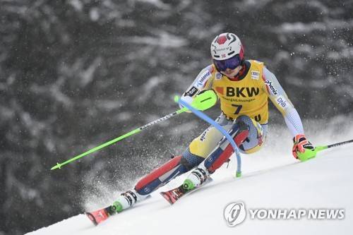 epa08940939 Henrik Kristoffersen of Norway in action during the first run of the Men's Slalom at the FIS Alpine Skiing World Cup in Flachau, Austria, 16 January 20201. EPA/CHRISTIAN BRUNA