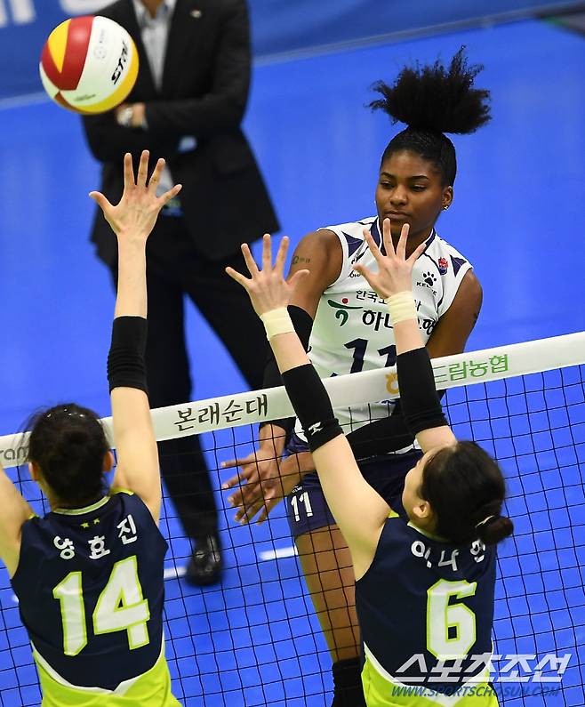 '2020-2021 V리그' 여자부 현대건설과 한국도로공사의 경기가 16일 수원실내체육관에서 열렸다. 한국도로공사 켈시가 블로킹 벽을 피해 공격을 시도하고 있다. 수원=박재만 기자 pjm@sportschosun.com/2021.01.16/
