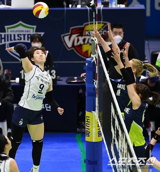 '2020-2021 V리그' 여자부 현대건설과 한국도로공사의 경기가 16일 수원실내체육관에서 열렸다. 한국도로공사 박정아가 블로킹 벽을 피해 공격을 시도하고 있다. 수원=박재만 기자 pjm@sportschosun.com/2021.01.16/