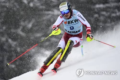epa08940944 Manuel Feller of Austria in action during the first run of the Men's Slalom at the FIS Alpine Skiing World Cup in Flachau, Austria, 16 January 20201. EPA/CHRISTIAN BRUNA