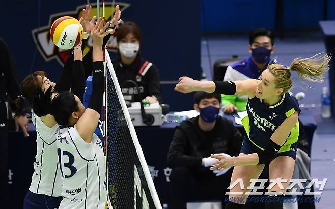 '2020-2021 V리그' 여자부 현대건설과 한국도로공사의 경기가 16일 수원실내체육관에서 열렸다. 현대건설 루소가 블로킹 벽을 피해 공격을 시도하고 있다. 수원=박재만 기자 pjm@sportschosun.com/2021.01.16/
