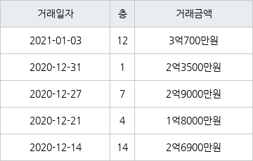 [이 기사는 조선비즈와 아티웰스가 공동으로 개발해 서비스하는 로봇 기사입니다.]국토교통부 실거래가 공개시스템에 따르면 지난 2021년 1월 3일 대구광역시 동구 신서동 아름다운나날3단지 12층 전용면적 84㎡형이 3억700만원에 거래됐다.