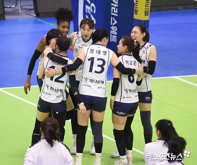 이날 경기에서 승리한 한국도로공사 선수들이 기뻐하고 있다.