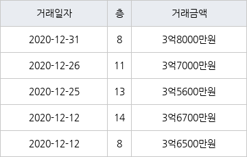 [이 기사는 조선비즈와 아티웰스가 공동으로 개발해 서비스하는 로봇 기사입니다.]국토교통부 실거래가 공개시스템에 따르면 지난 2020년 12월 31일 인천광역시 서구 가좌동 가좌두산위브트레지움1,2단지아파트 8층 전용면적 59㎡형이 3억8000만원에 거래됐다.