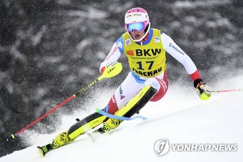 epa08940963 Tanguy Nef of Switzerland in action during the first run of the Men's Slalom at the FIS Alpine Skiing World Cup in Flachau, Austria, 16 January 20201. EPA/CHRISTIAN BRUNA