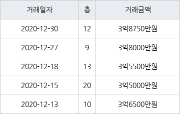 [이 기사는 조선비즈와 아티웰스가 공동으로 개발해 서비스하는 로봇 기사입니다.]국토교통부 실거래가 공개시스템에 따르면 지난 2020년 12월 30일 인천광역시 서구 당하동 당하 KCC스위첸 아파트 12층 전용면적 85㎡형이 3억8750만원에 거래됐다.