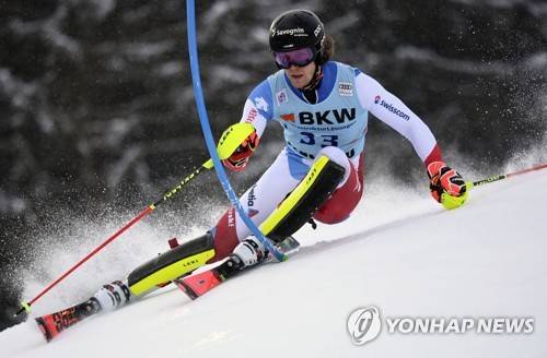 epa08941022 Sandro Simonet of Switzerland in action during the first run of the Men's Slalom at the FIS Alpine Skiing World Cup in Flachau, Austria, 16 January 2021. EPA/CHRISTIAN BRUNA