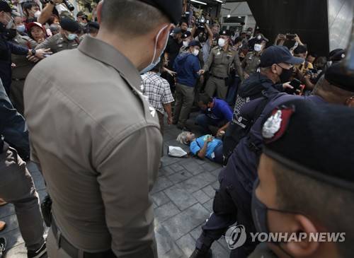 epa08941025 A woman lays on the ground (C) after the police officers attempted to arrest during a rally at the Victory Monument in Bangkok, Thailand, 16 January 2021. At least two protesters was arrested by the police on the violating an emergency decree while attend a rally for writing messages against the government on a fabric label that is 112 meters long during the lese majeste law protest in Bangkok. More than 30 of the protesters and anti-government leaders, who took part in the pro-democracy protests, are facing the lese majeste charges under section 112 of the Thai criminal code, and one of them is the first youth with 16 years old, which is the youngest in the case. The protests are calling for the political and monarchy reforms and the resignation of the prime minister. EPA/NARONG SANGNAK