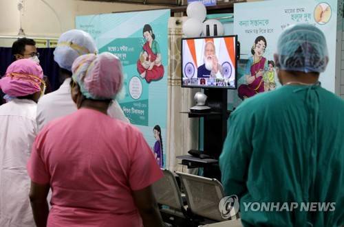 epa08941035 Medical staff watch a TV as the Indian Prime Minister given a live speech before a beneficiary gets a first dose of a Covid-19 vaccine shot, manufactured by Serum Institute of India, inside Vaccination Centre at Bangur hospital in Kolkata, Eastern India, 16 January 2021. One of the world's biggest and nationwide COVID-19 vaccination drive launched by Indian prime minister Narendra Modi and aimed at inoculating 30 million people starts in first drive that include front line workers like Accredited Social Health Activist (ASHA) doctors, MBBS students, nurses etc. EPA/PIYAL ADHIKARY