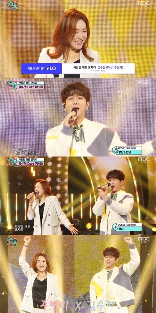 오늘(16일) 방송된 MBC ‘쇼! 음악중심’에 출연한 김수찬과 주현미는 신곡 ‘사랑만 해도 모자라’로 컴백 무대를 선보였다. 지난 14일, 첫 듀엣곡을 발매한 김수찬은 새해 첫 활동을 트로트계 대선배 주현미와의 컬래버레이션 프로젝트로 준비해 대중들의 이목을 집중시켰다.