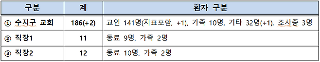 - (경기 용인시 수지구 교회 관련) 접촉자 추적관리 중 2명이 추가 확진되어 현재까지 누적 확진자는 총 209명이다.