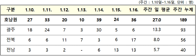 - (전남 영암군 사찰 관련) 1월 14일 첫 확진자 발생 이후 접촉자 조사 중 12명이 추가 확진되어 현재까지 누적 확진자는 총 13명*이다.