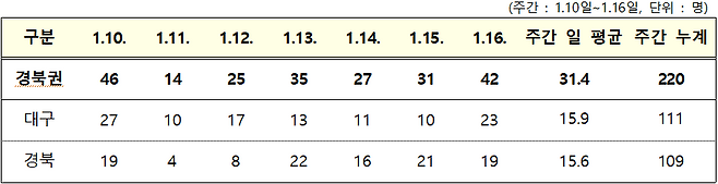 - (경북 구미시 일가족2 관련) 1월 13일 첫 확진자 발생 이후 접촉자 조사 중 12명이 추가 확진되어 현재까지 누적 확진자는 총 13명*이다.