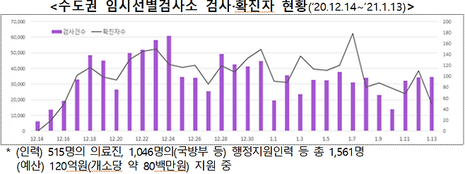 ○ 지난해 12월 14일부터 서울, 경기, 인천은 유동 인구가 많은 곳에 총 144개소의 임시선별검사소를 설치·운영 중*이다.