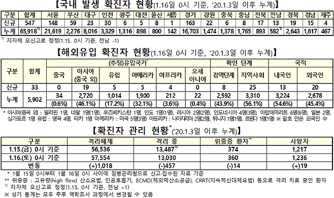 □ 질병관리청 중앙방역대책본부(본부장 : 정은경 청장)는 1월 16일 0시 기준으로, 국내 발생 신규 확진자는 547명, 해외유입 사례는 33명이 확인되어 총 누적 확진자 수는 71,820명(해외유입 5,902명)이라고 밝혔다.