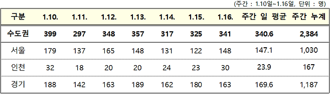 ○ 1월 16일 0시 기준 국내발생 신규 확진자는 547명이며(최근 1주간 일 평균 516.1명), 수도권에서 341명(62.3%), 비수도권에서는 206명(37.7%)이 발생하였다.