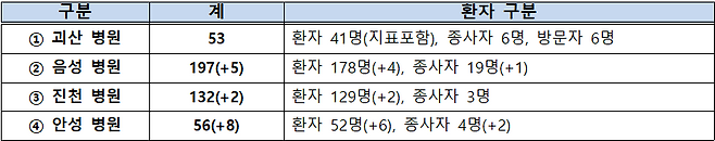 - (충북 괴산군/음성군/진천군/경기 안성시 병원 관련) 격리자 추적검사를 통해 15명이 추가 확진되어 현재까지 누적 확진자는 총 438명이다.