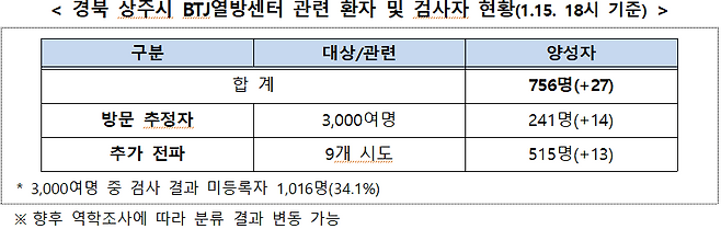 ○ 경북 상주시 BTJ 열방센터 관련 확진자는 756명(’21.1.15. 18시기준)으로, 여전히 다수의 미 검사자가 있음을 지적하며