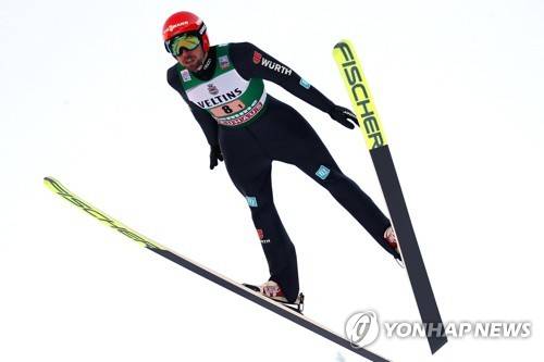 epa08941194 Johannes Rydzek of Germany in action during the Ski Jumping portion of the men's Team Sprint NH/2x7.5km competition at the FIS Nordic Combined World Cup in Val di Fiemme, Italy, 16 January 2021. EPA/ANDREA SOLERO
