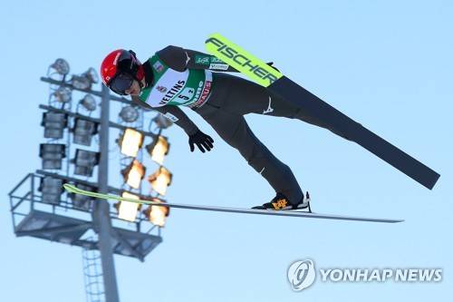epa08941217 Ryota Yamamoto of Japan in action during the Ski Jumping portion of the men's Team Sprint NH/2x7.5km competition at the FIS Nordic Combined World Cup in Val di Fiemme, Italy, 16 January 2021. EPA/ANDREA SOLERO