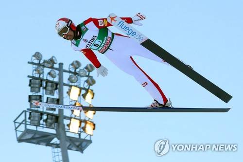 epa08941220 Lukas Klapfer of Austria in action during the Ski Jumping portion of the men's Team Sprint NH/2x7.5km competition at the FIS Nordic Combined World Cup in Val di Fiemme, Italy, 16 January 2021. EPA/ANDREA SOLERO