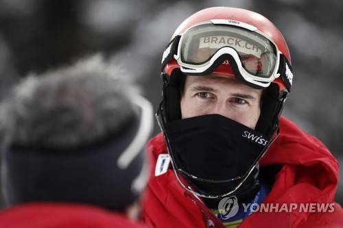 Switzerland's Ramon Zenhaeusern walks on the course before the start of the second run of an alpine ski, men's World Cup slalom in Flachau, Austria, Saturday, Jan. 16, 2021. (AP Photo/Gabriele Facciotti)